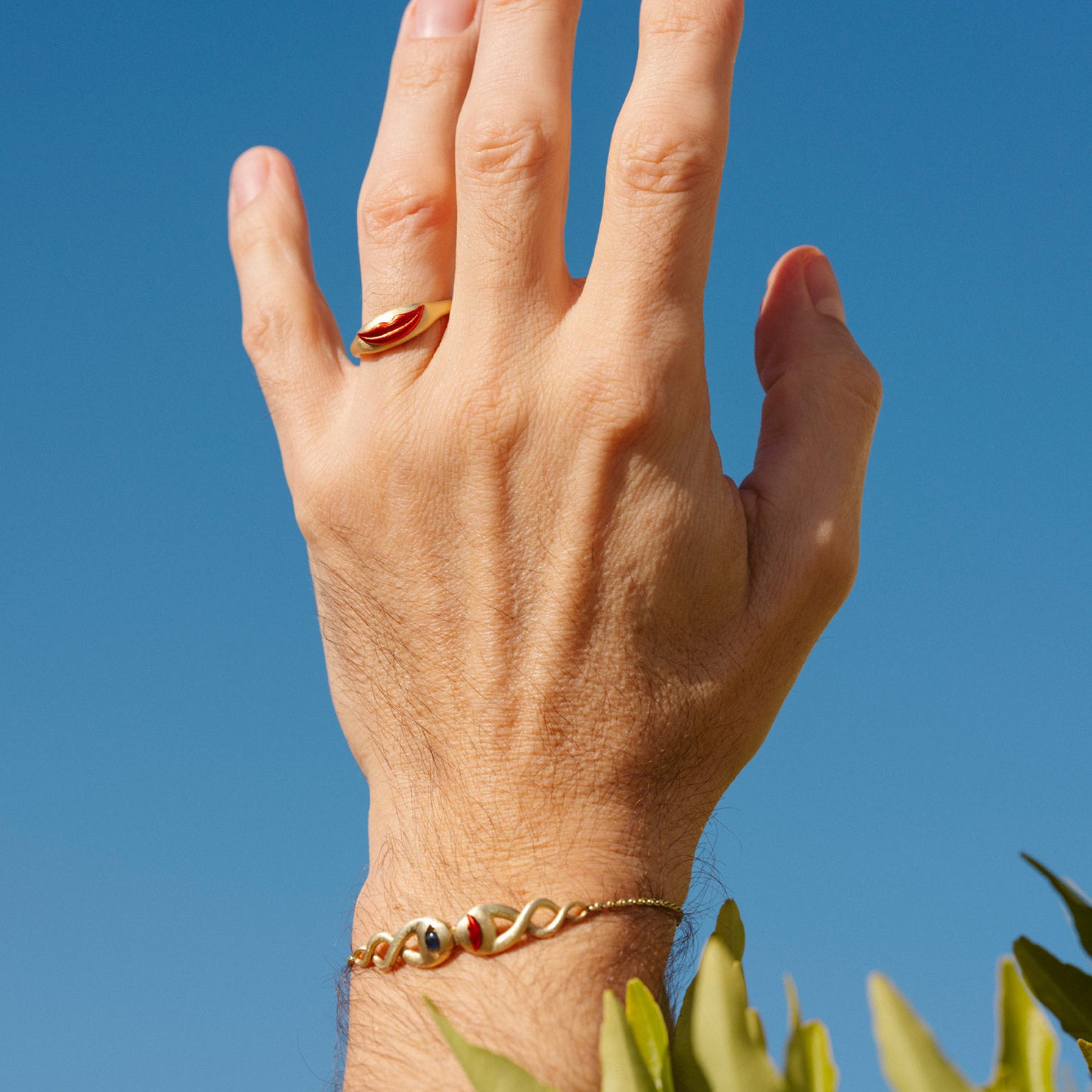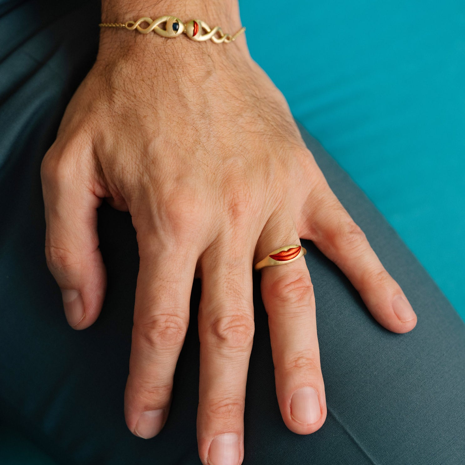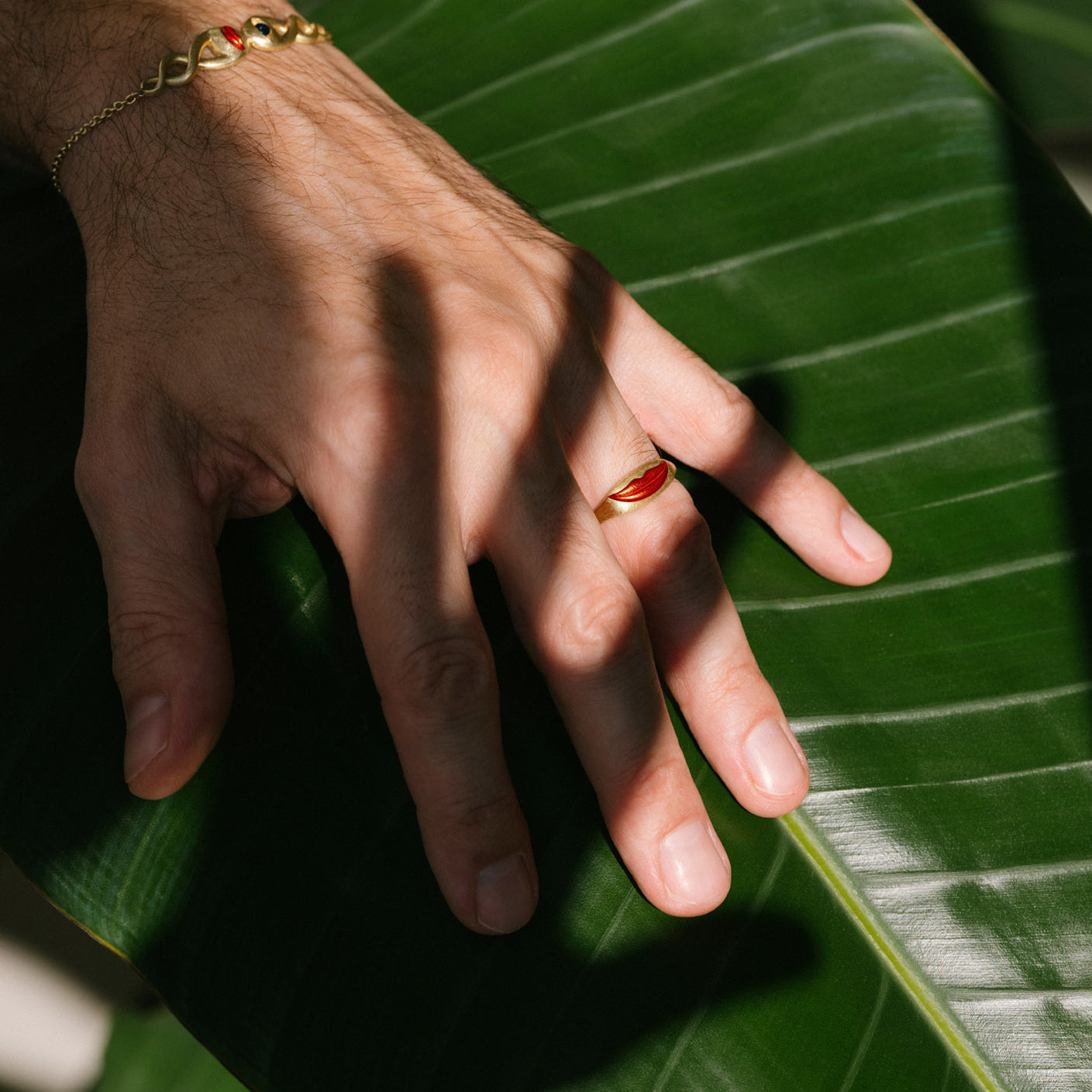 The ring is made of 18k gold-plated 925 sterling silver and a special red varnish.